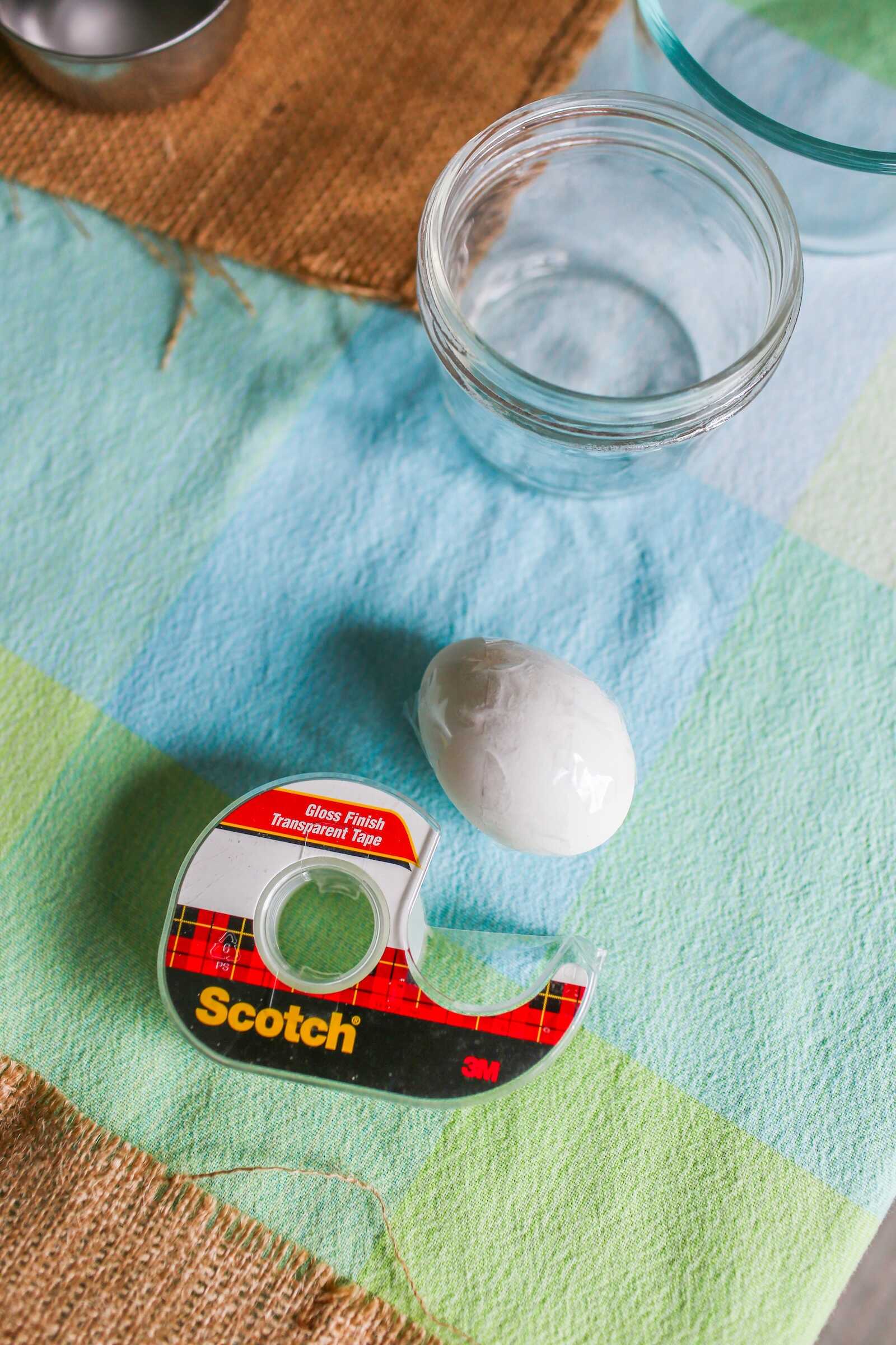 Tear off strips of Scotch tape and place them across the egg in different directions. Don’t cover the whole egg—only about half. For the best tie-dye effect, crisscross the tape at different lengths and angles so the tape creates “resist” lines in the dye.